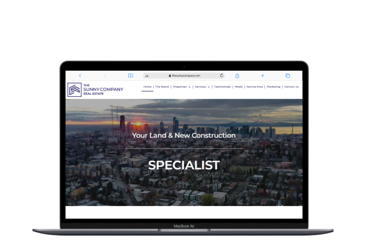 The website showcases The Sunny Company as a specialist team in land acquisition and new-construction sales, blending innovation with practicality. The site features a clean layout with clear navigation into their core services — land, building sustainable homes, home-buyer services — and an emphasis on expertise in select markets. With modern visuals and concise messaging, the website delivers a streamlined experience for clients looking for smart real estate solutions.